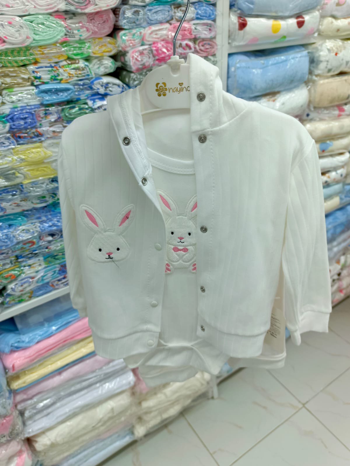 3-piece set for a baby girl , consisting of a light jacket, a white body suit, and matching pants. This type of set is designed for comfort and style for babies, often made from soft materials like cotton.