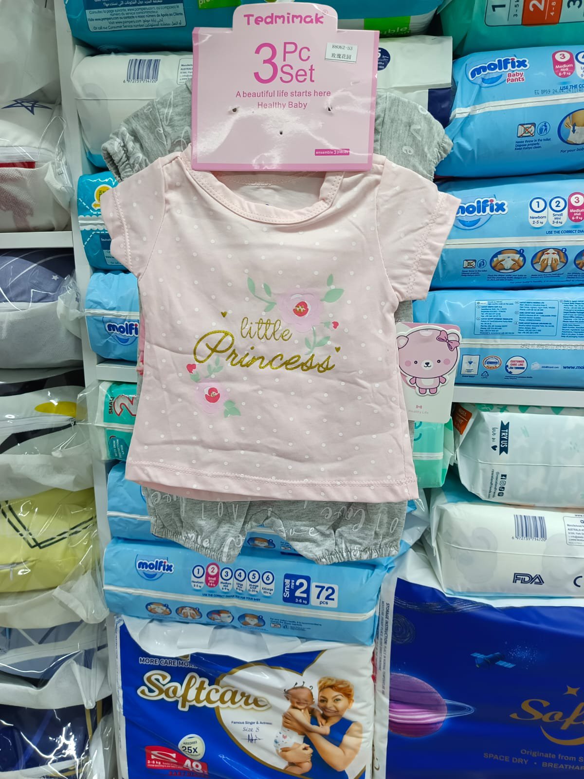 3 Pc Set of baby clothing with short-sleeved top with shorts along with a short romper.This type of set is common for newborn and infant wear, offering coordinated outfits for babies.