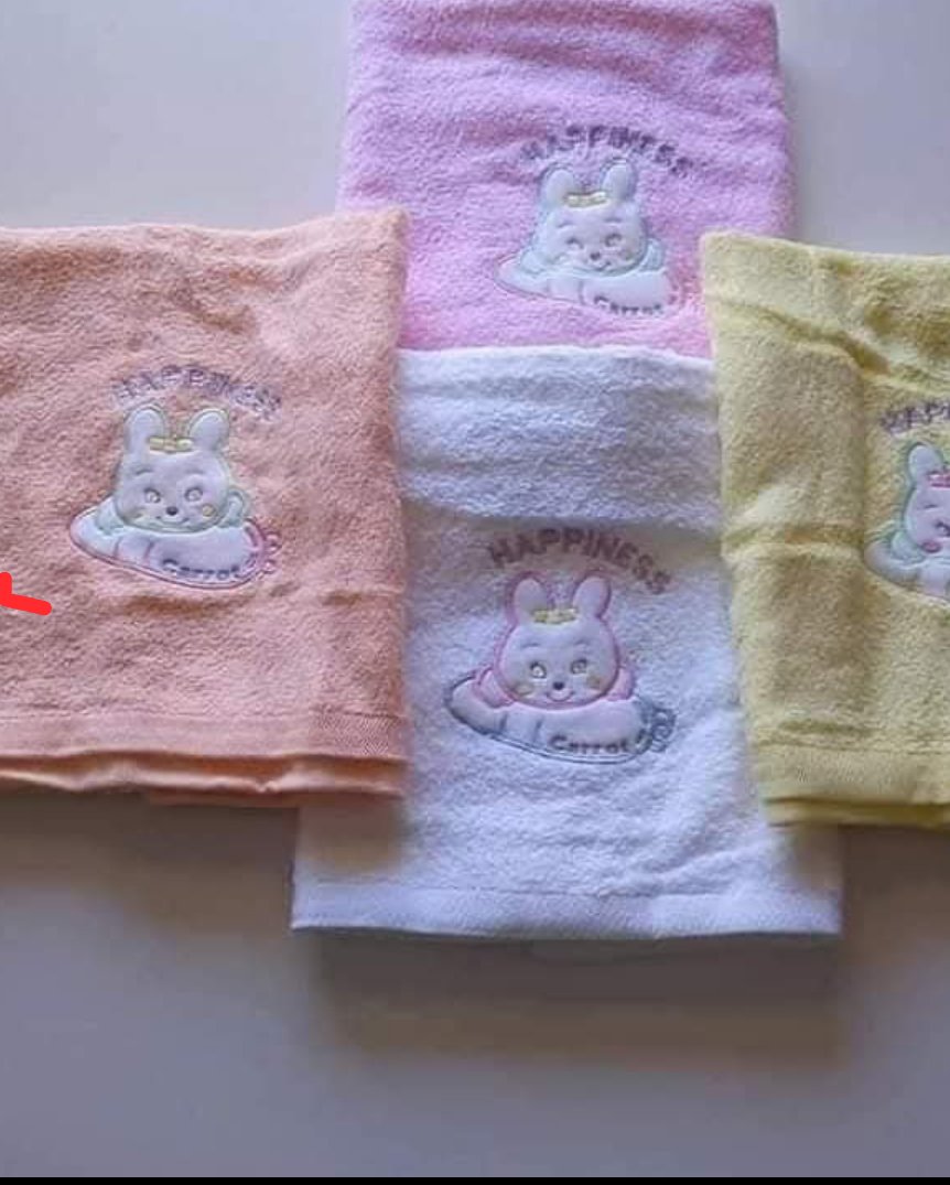 - The towels in the image feature a cartoon rabbit design with the word “Happiness” and “Carrot” embroidered.