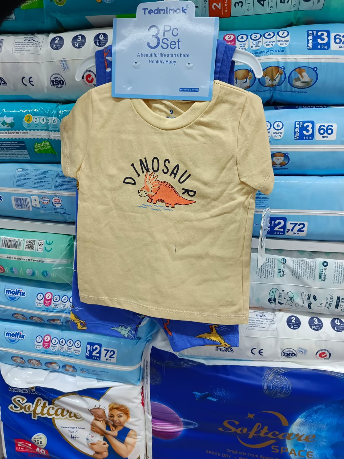 3 Pc Set of baby clothing with short-sleeved top with shorts along with a short romper. This type of set is common for newborn and infant wear, offering coordinated outfits for babies.