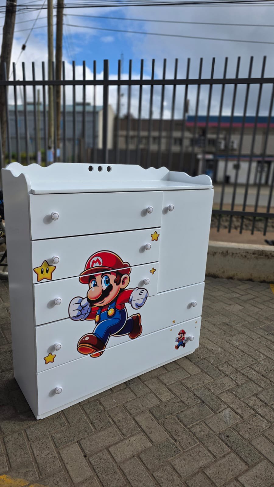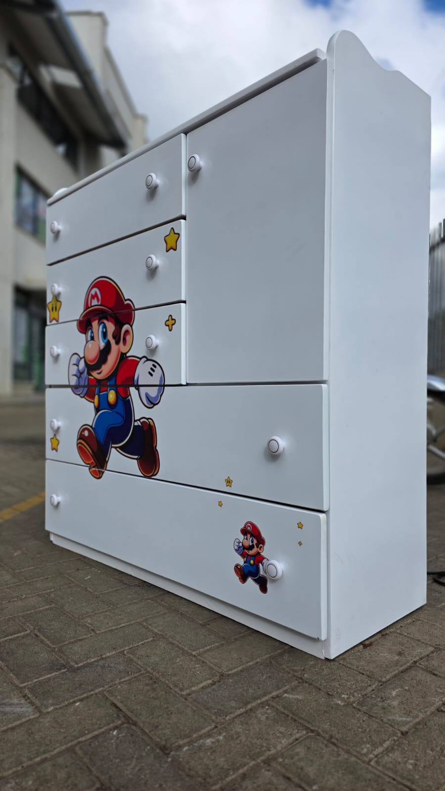 Super Mario-themed baby chest of drawers is a custom-designed nursery organizer.