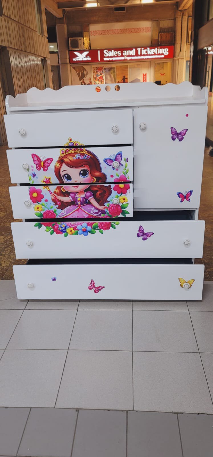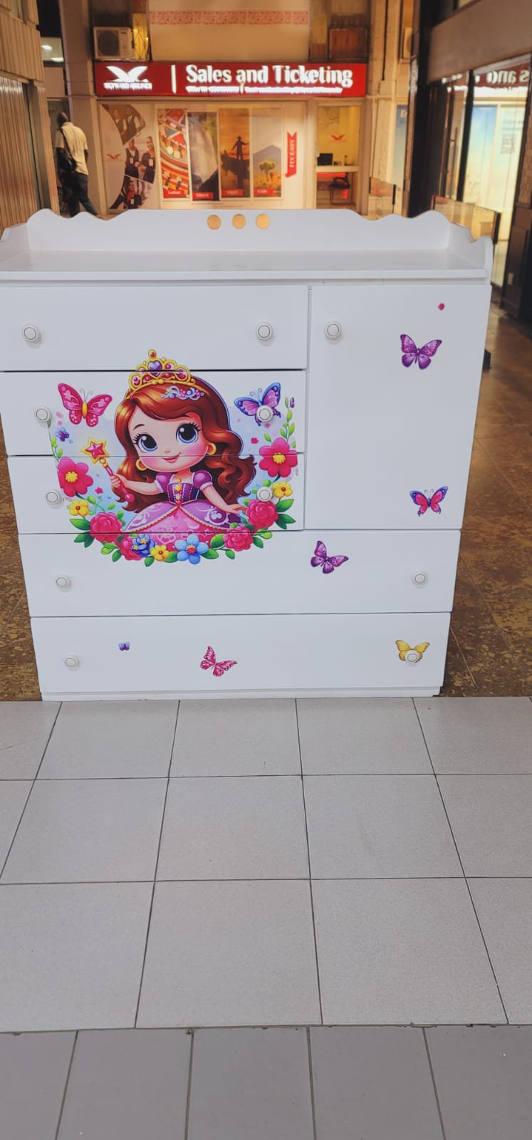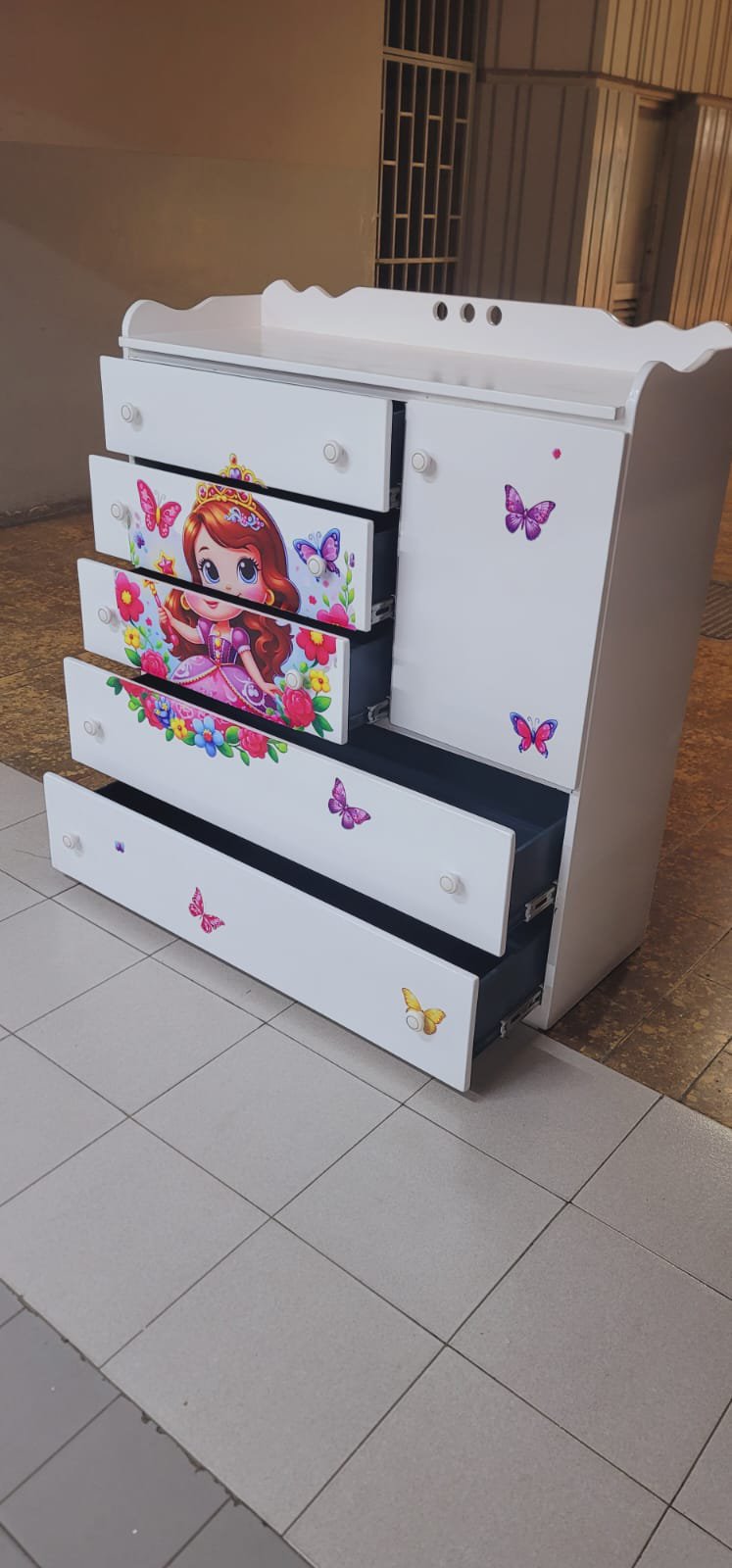 cartoon-themed baby chest of drawers, specifically a 4ft by 4ft model crafted from white Medium-Density Fiberboard (MDF).