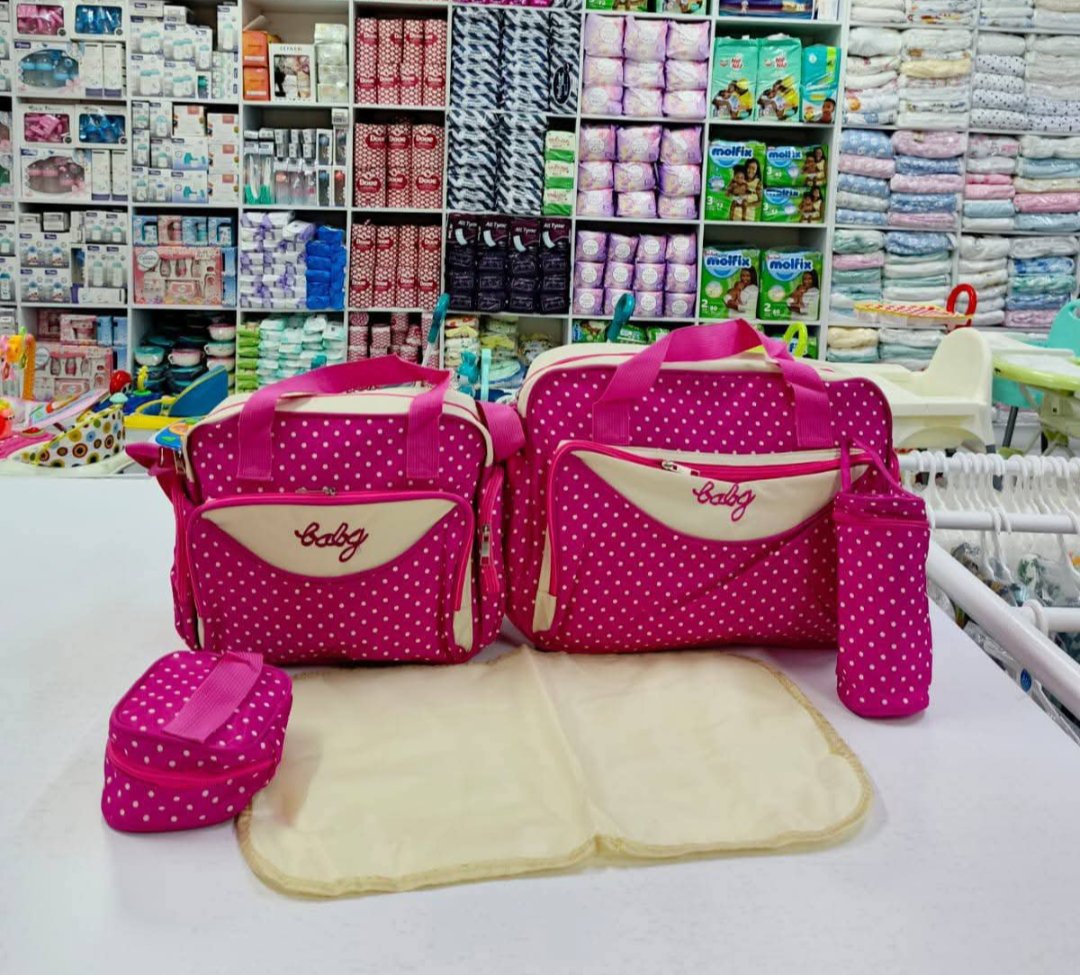 Made with top of the range synthetic material, a set of this Diaper bag contains 1 big bag, 1 medium sized bag, 1 padded changing pad, dirty duds bag and 1 feeding bottle holder.