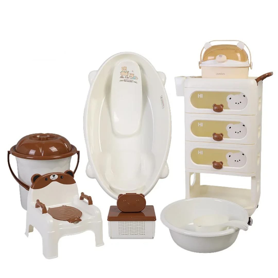 Baby bath station set, which typically includes a bathtub, a potty seat, a bucket, a washbasin, and a multi-tier storage cart.