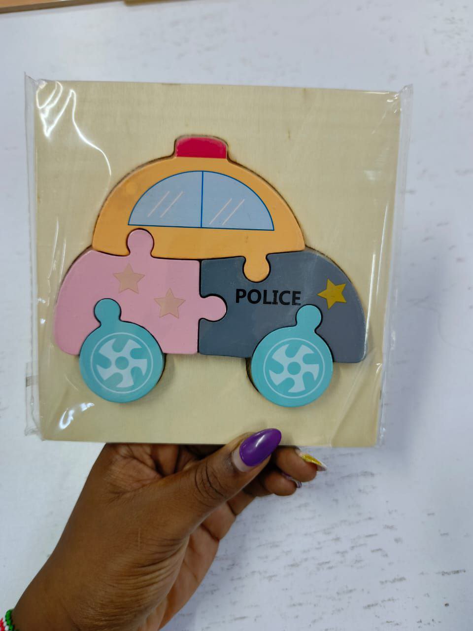 wooden jigsaw puzzle featuring a police car, designed for children.